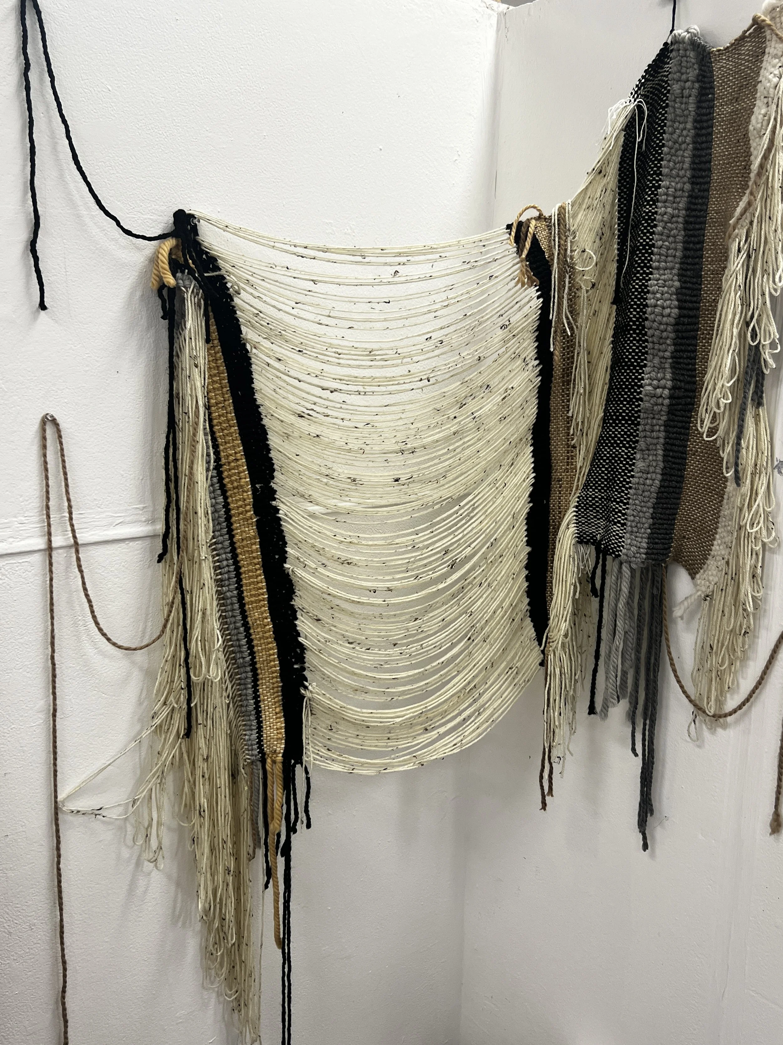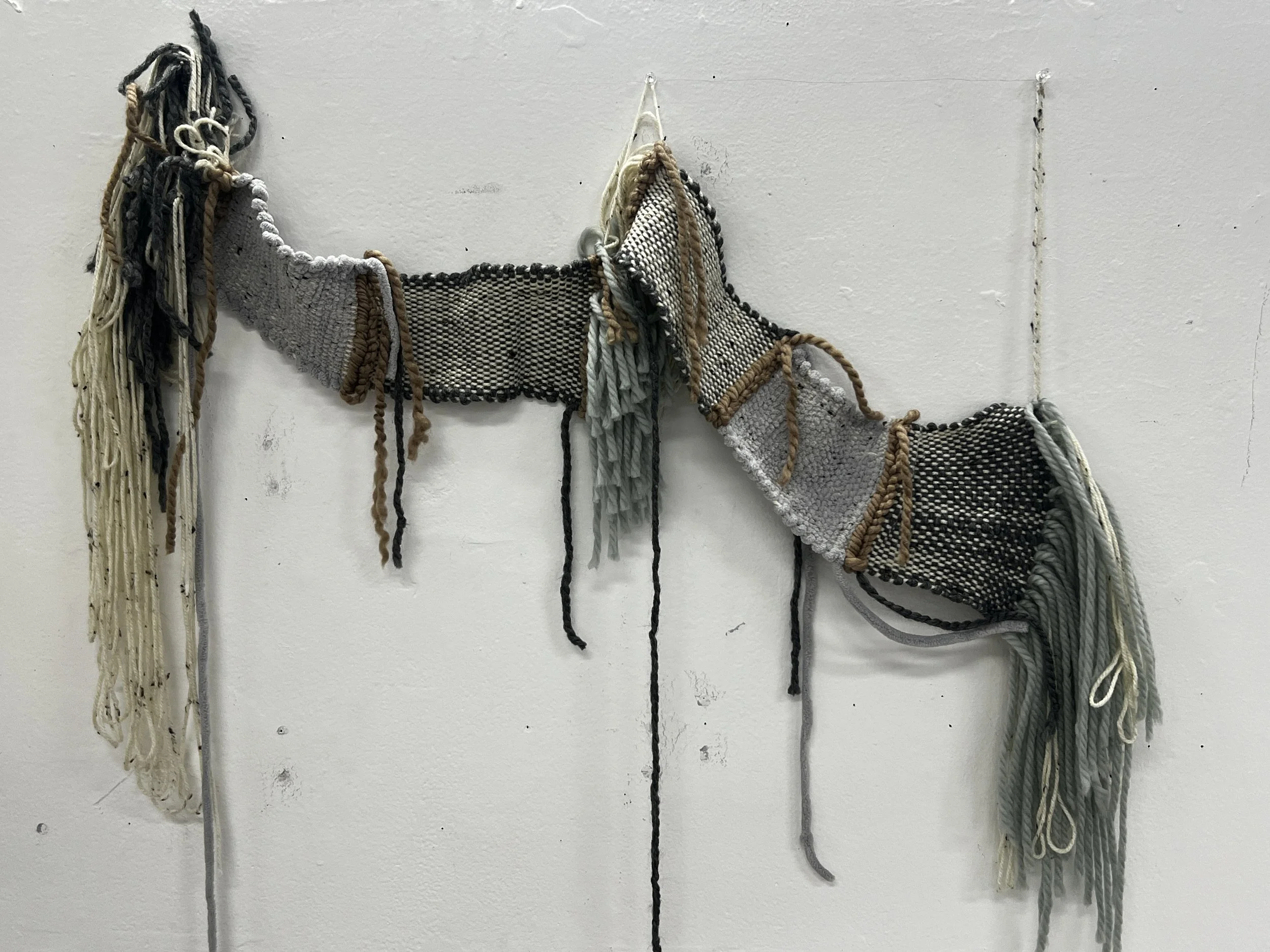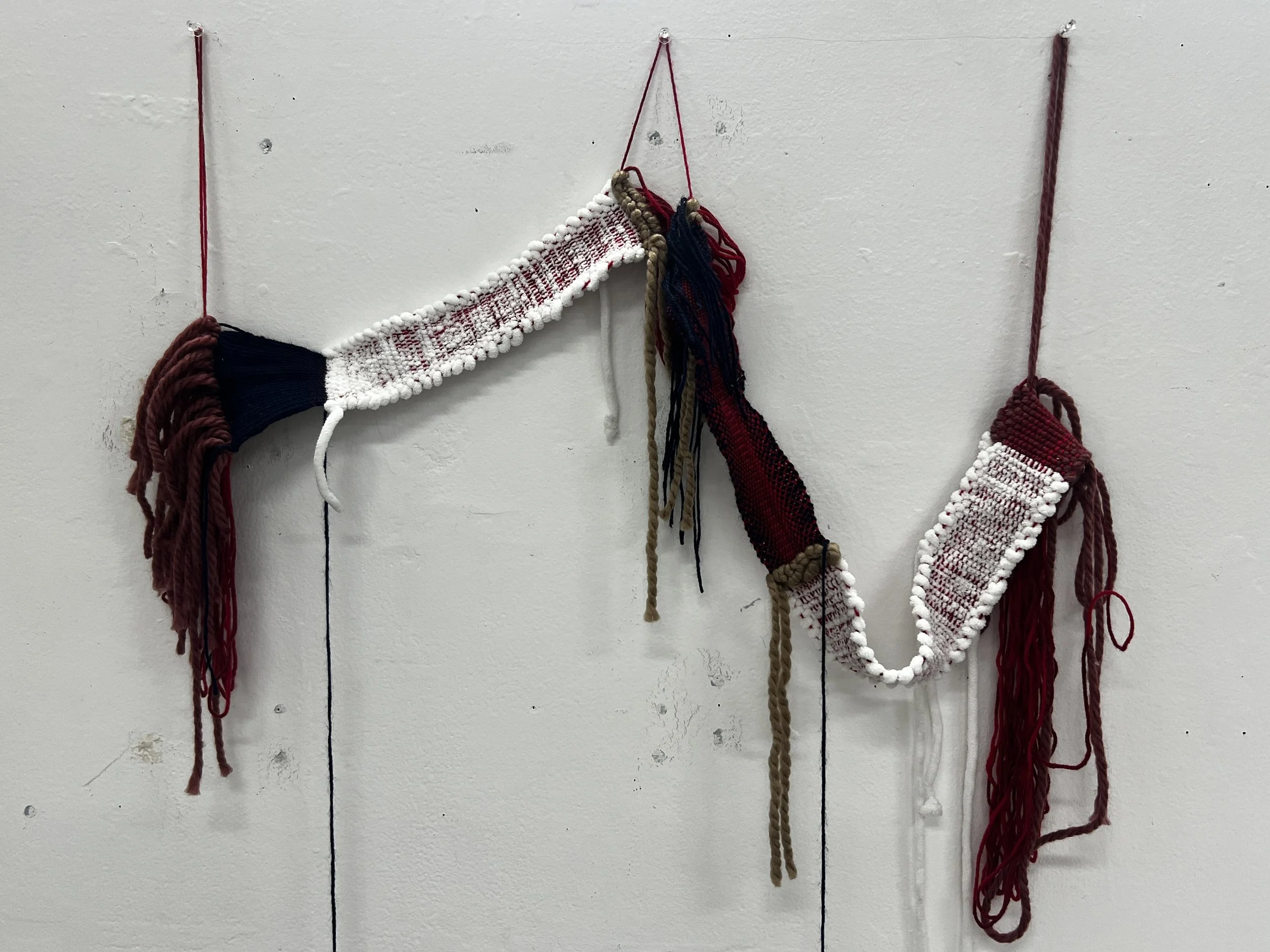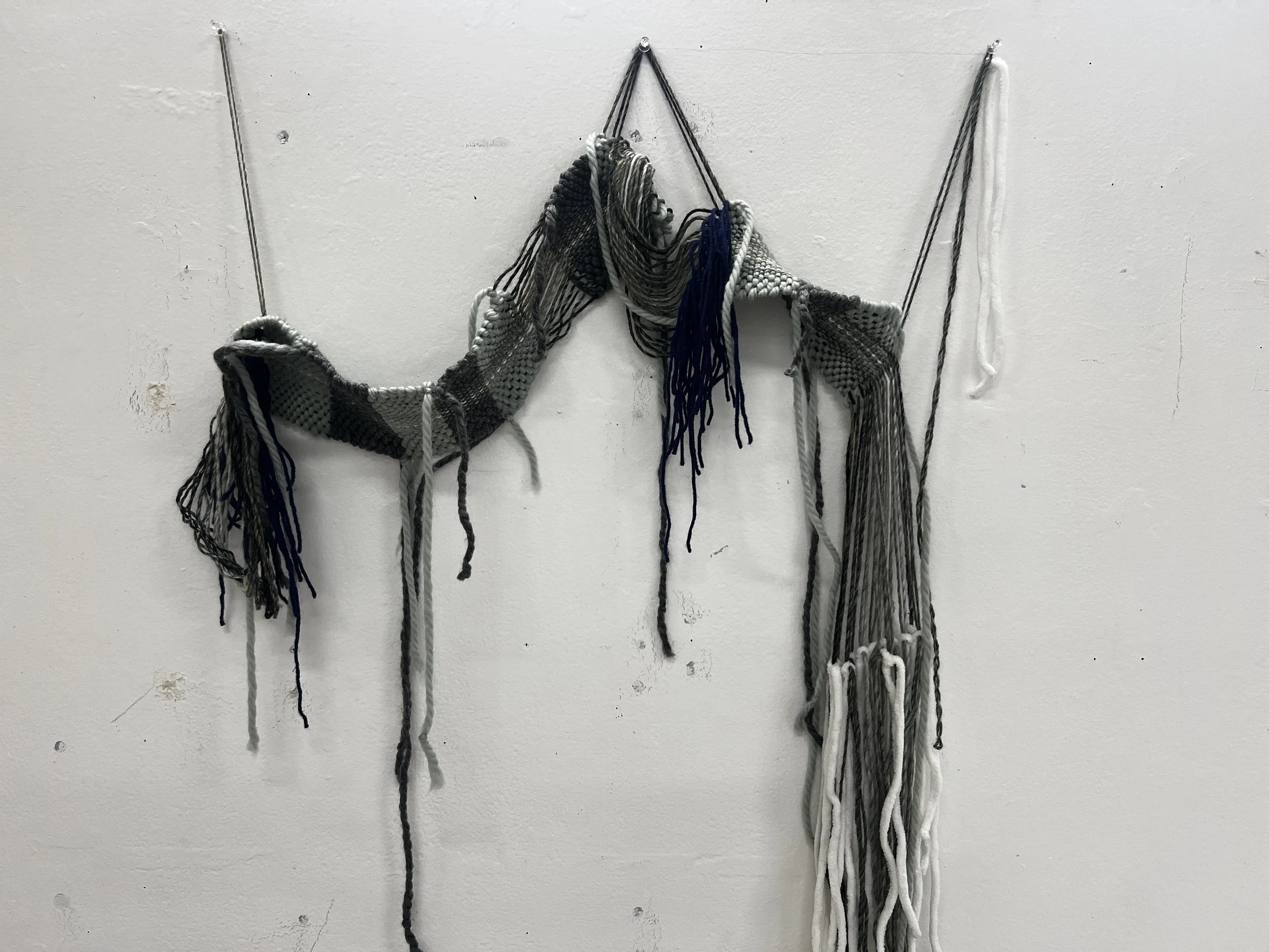 Puro, Chile, es tu cielo azulado (2024) explores the complexities of living between cultures by this unstable process of translation. This project has been explored through unfamiliar mediums, particularly video performance and soft sculptural weaving.